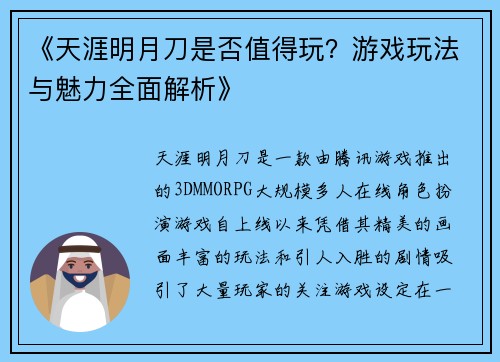 《天涯明月刀》是一款由腾讯游戏推出的3DMMORPG(大规模多人在线角色扮演游戏),自上线以来凭借其精美的画面、丰富的玩法和引人入胜的剧情,吸引了大量玩家的关注。游戏设定在一个架空的江湖世界,玩家可以选择不同的武侠角色,探索这个充满恩怨情仇的武侠世界。本文将从游戏玩法、战斗系统、社交互动、世界观等方面,全面解析《天涯明月刀》的魅力,帮助玩家判断这款游戏是否值得一试。通过对这些方面的深入了解,玩家可以更好地评估游戏的优缺点,决定是否投入时间与精力。